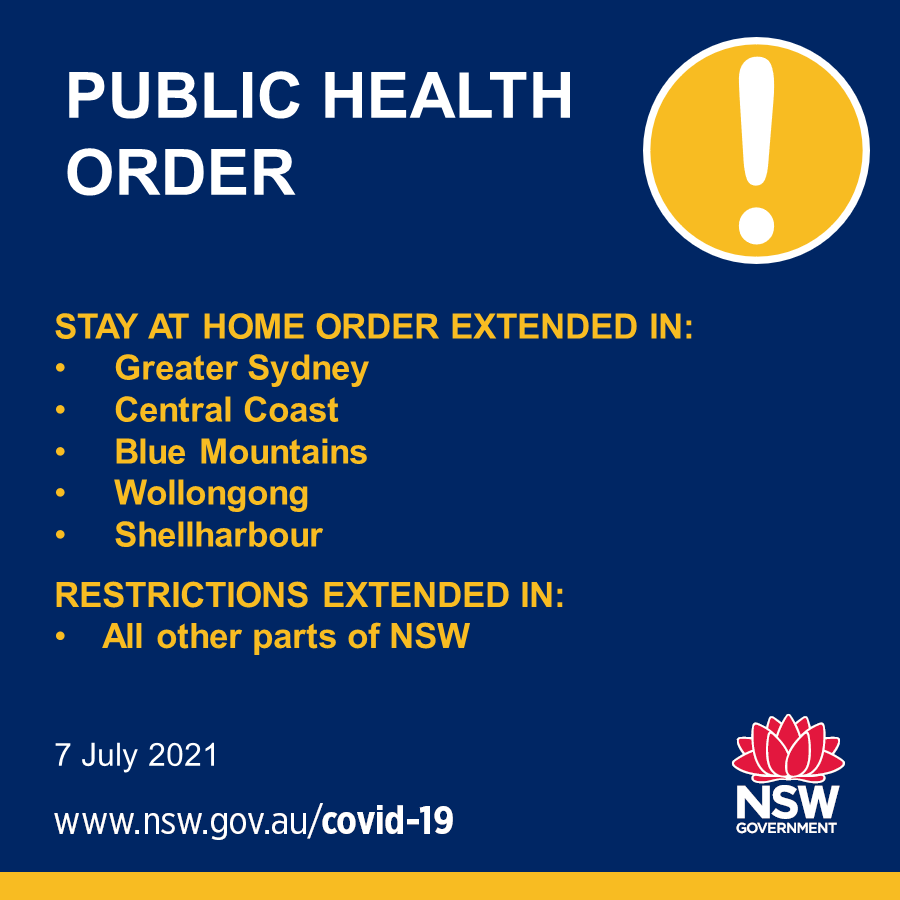 Nsw Health On Twitter Public Health Order Stay At Home Orders Extended To All Of Greater Sydney Blue Mountains Central Coast And Wollongong Restrictions Apply To The Rest Of Nsw Https T Co Cs665gk9qq